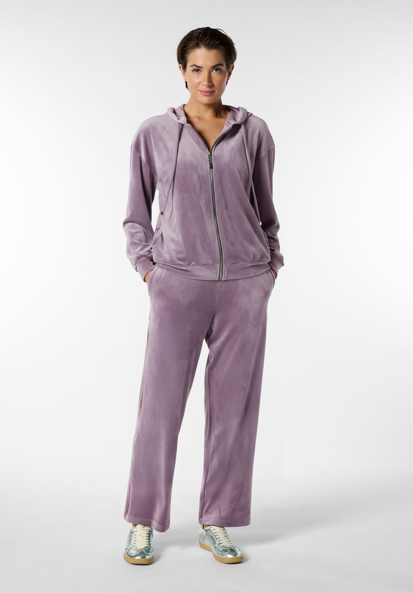 Tuta due pezzi in morbida ciniglia, pensata per offrire comfort e un tocco di eleganza anche nei momenti di relax. La giacca è dotata di zip frontale, cappuccio e tasche laterali, con una vestibilità pratica e avvolgente. I pantaloni presentano elastico in vita con coulisse regolabile e tasche laterali, per un look casual ma curato. Ideale per il tempo libero, i viaggi o semplicemente per coccolarsi con stile.