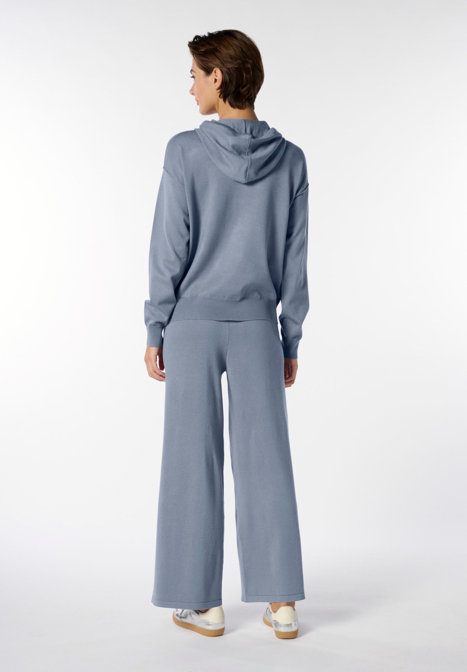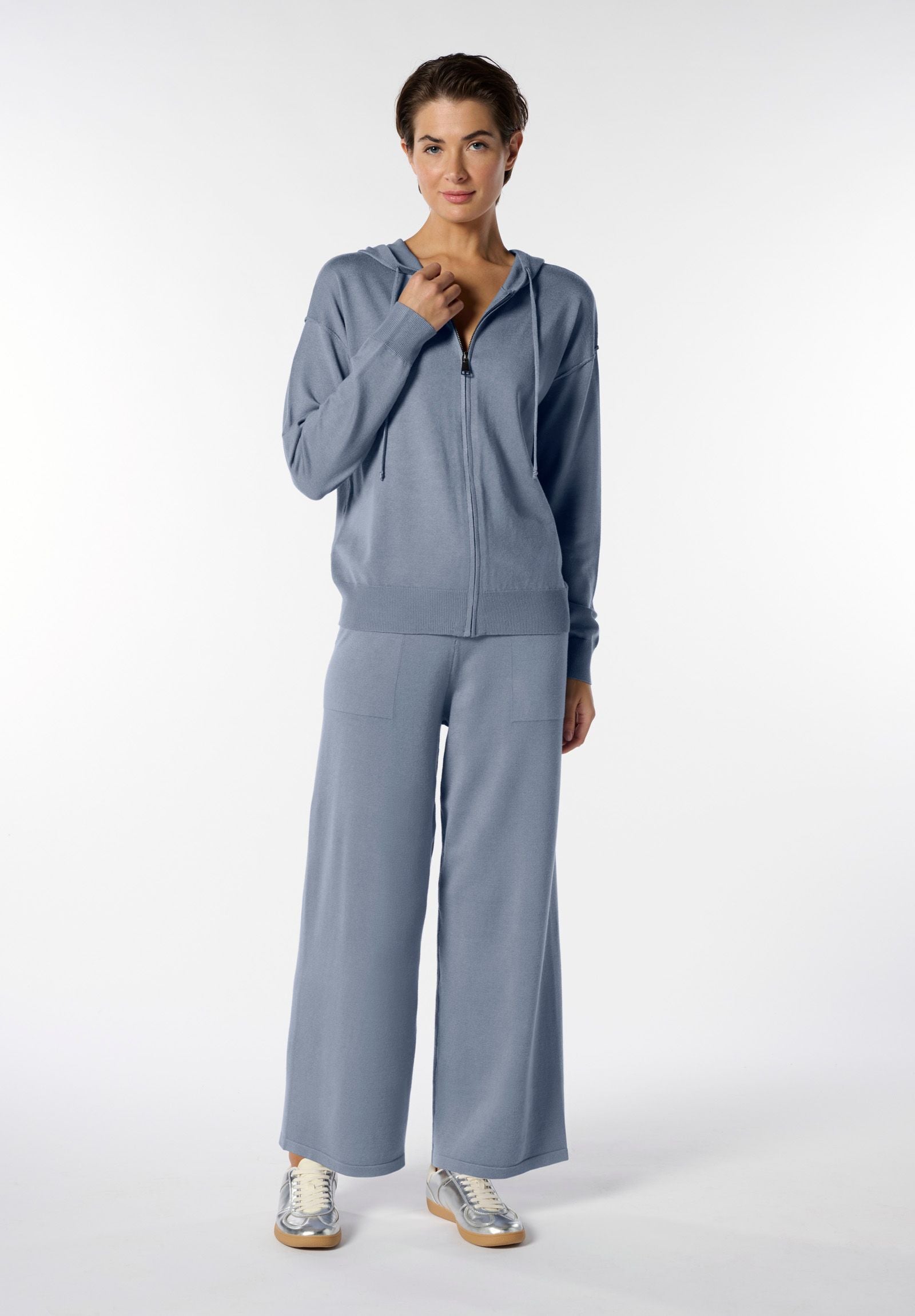 Tuta due pezzi realizzata in morbido filato a maglia di viscosa, ideale per chi cerca comodità senza rinunciare allo stile. La felpa, dal taglio confortevole, è dotata di cappuccio e zip frontale per un tocco sportivo e pratico. Il pantalone ampio con coulisse in vita e tasche a vista sui fianchi completa l’outfit con funzionalità e morbidezza. Un completo perfetto per il tempo libero, i momenti di relax o i look dinamici e contemporanei.